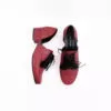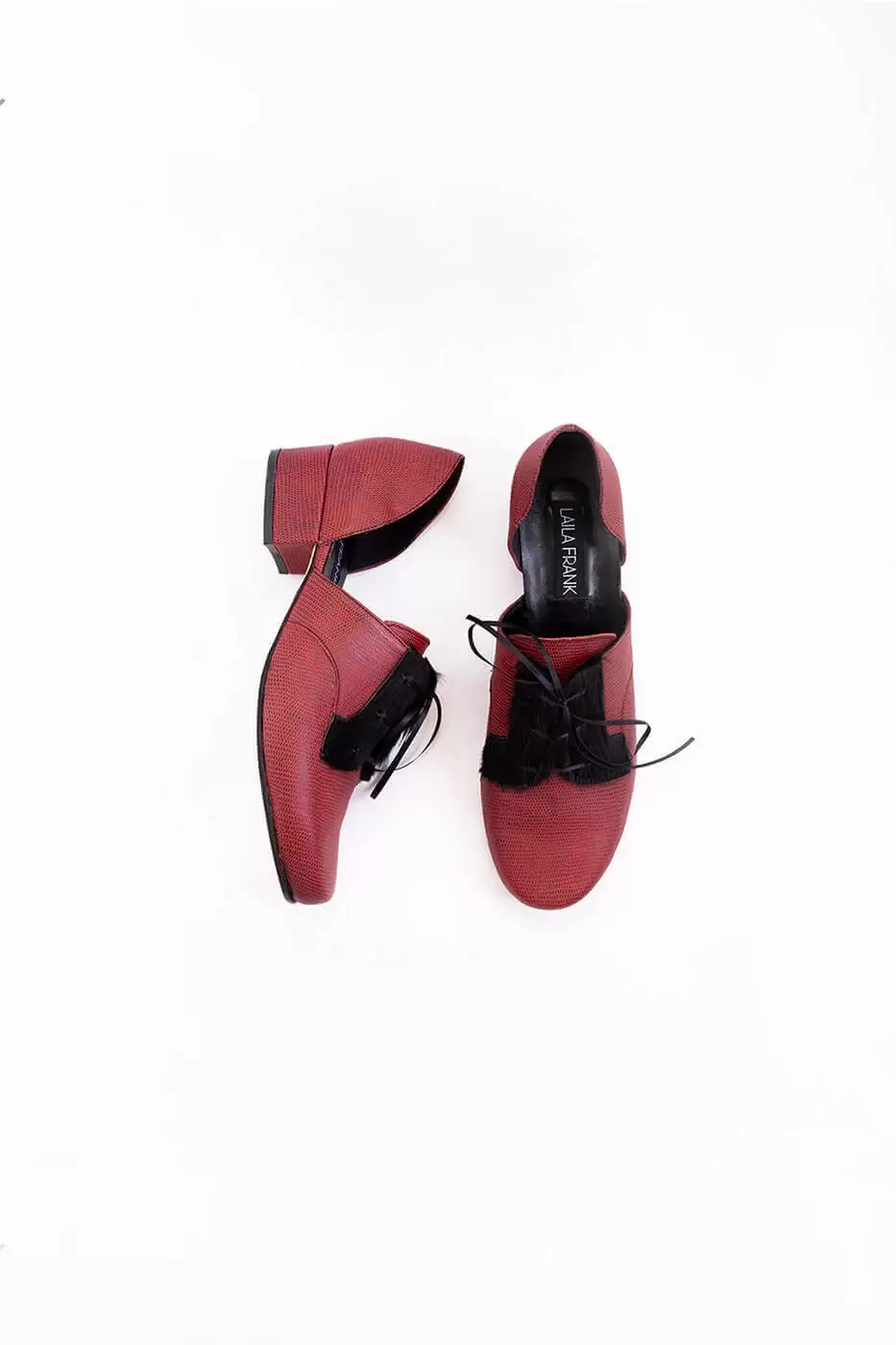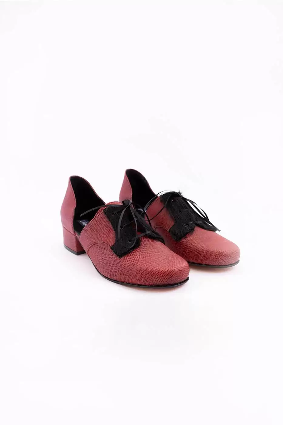 Mocasín de cuero graneado con cordonera de pelo y cordón en cinta al tono