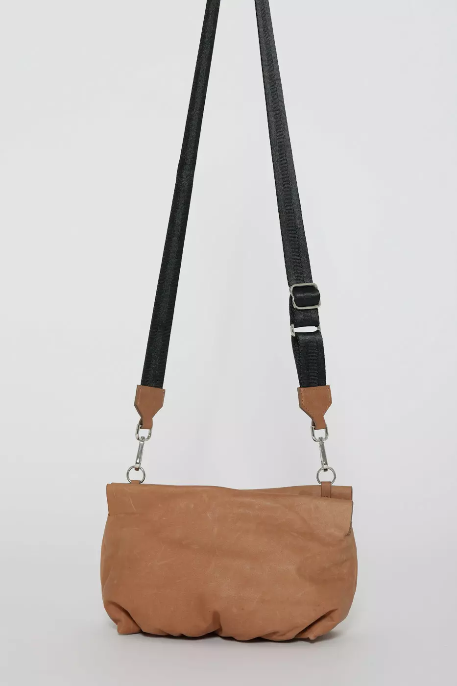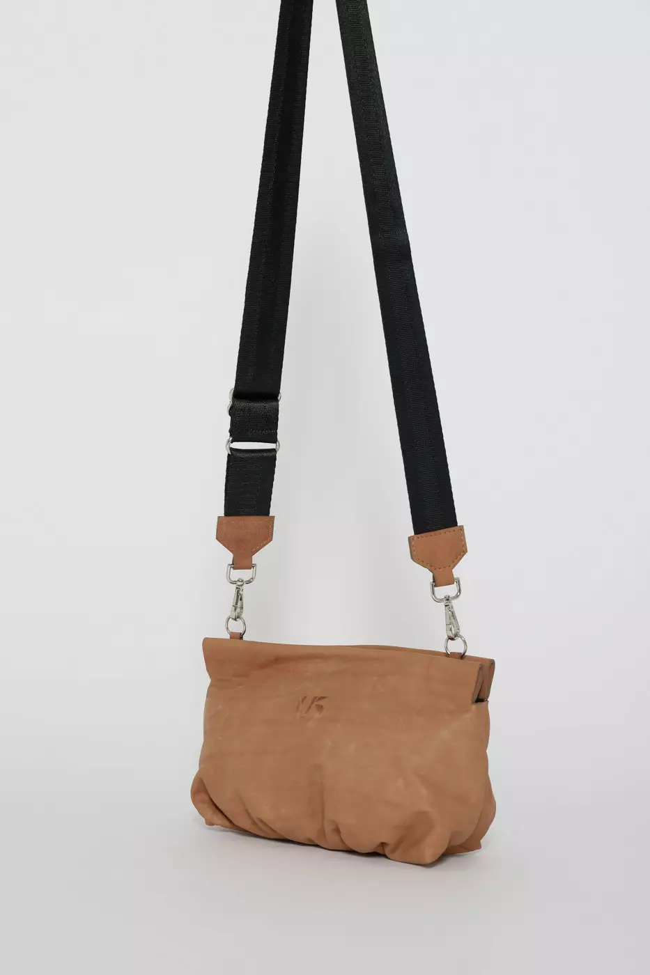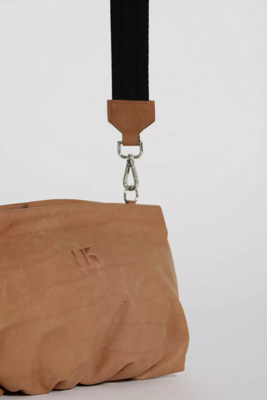 Bandolera de cuero color suela con detalle en cinta gross. Desmontable. Acceso superior con cierre metálico con bolsillo interno