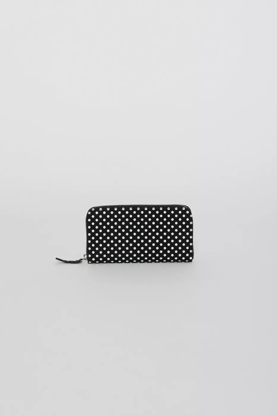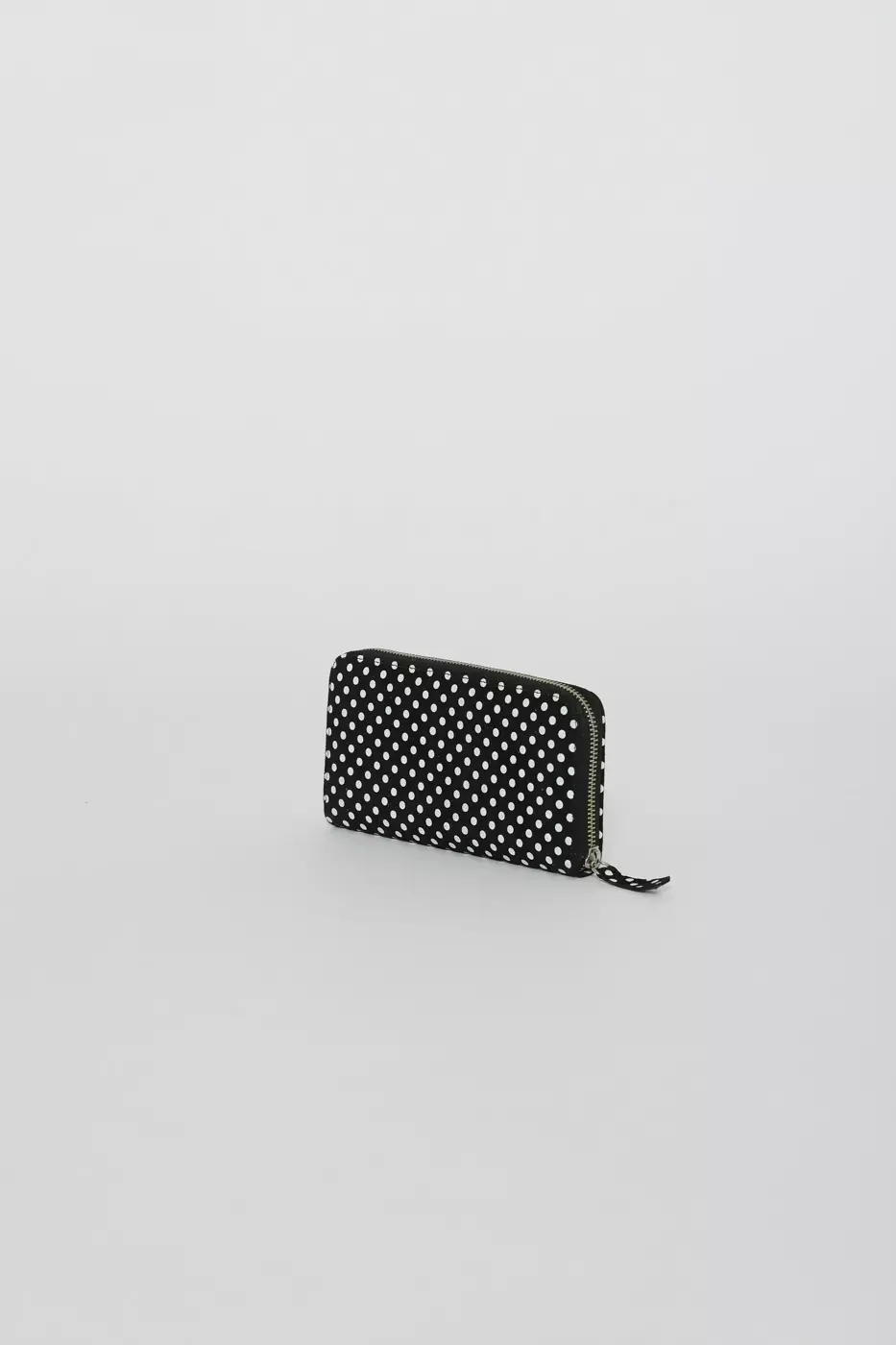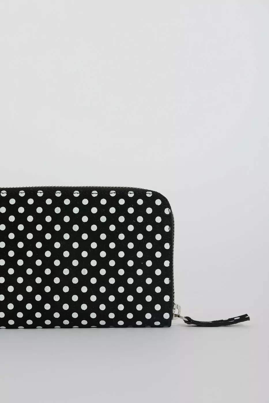 Descripción: Billetera en gamuza negra con lunares blancos, cierre metálico. Interior con divisiones y bolsillo con cierre