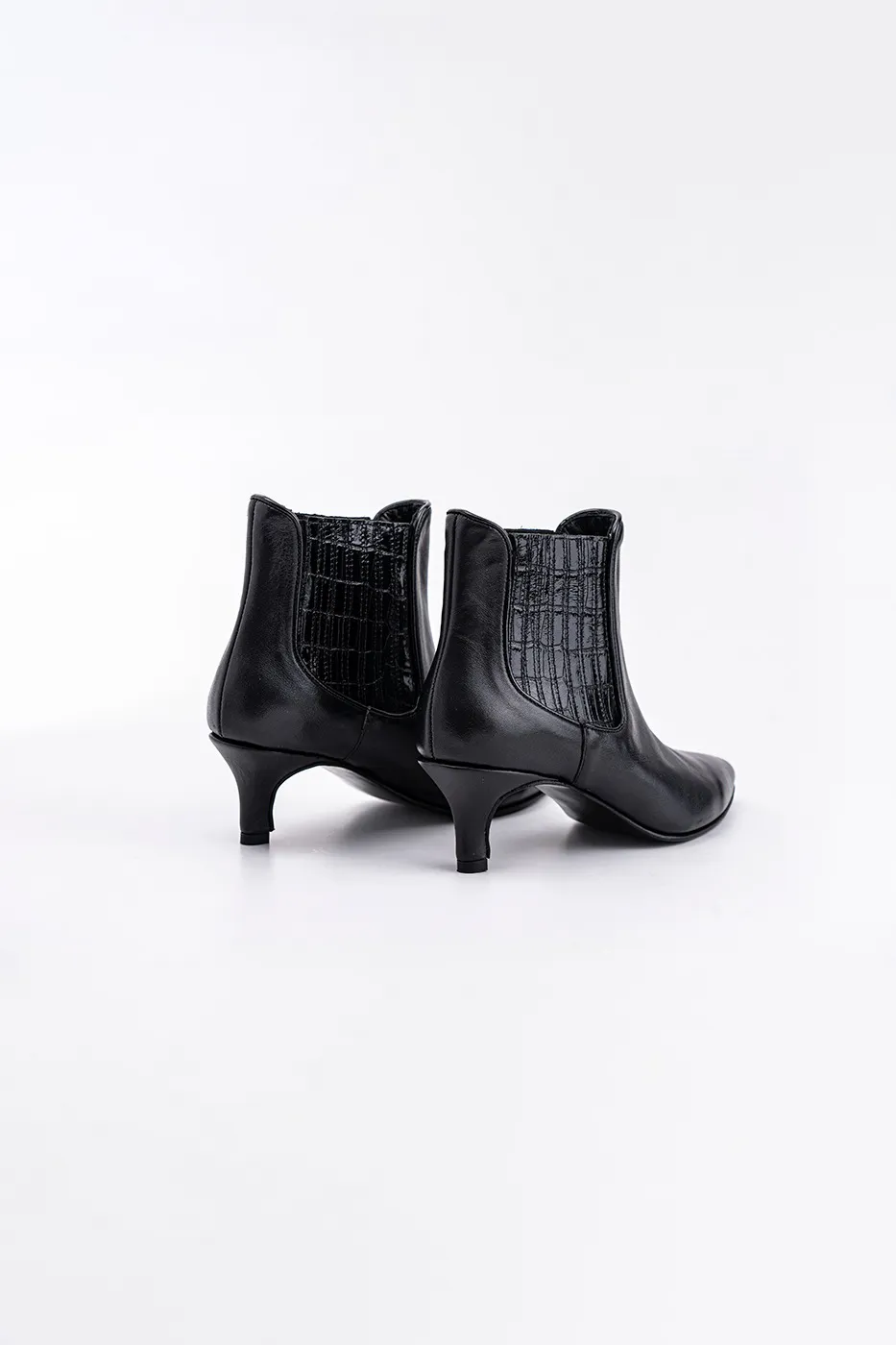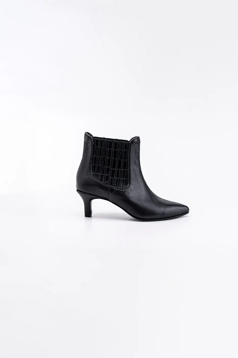 Botineta con elástico lateral forrado en cuero al tono y vivo de charol al tono