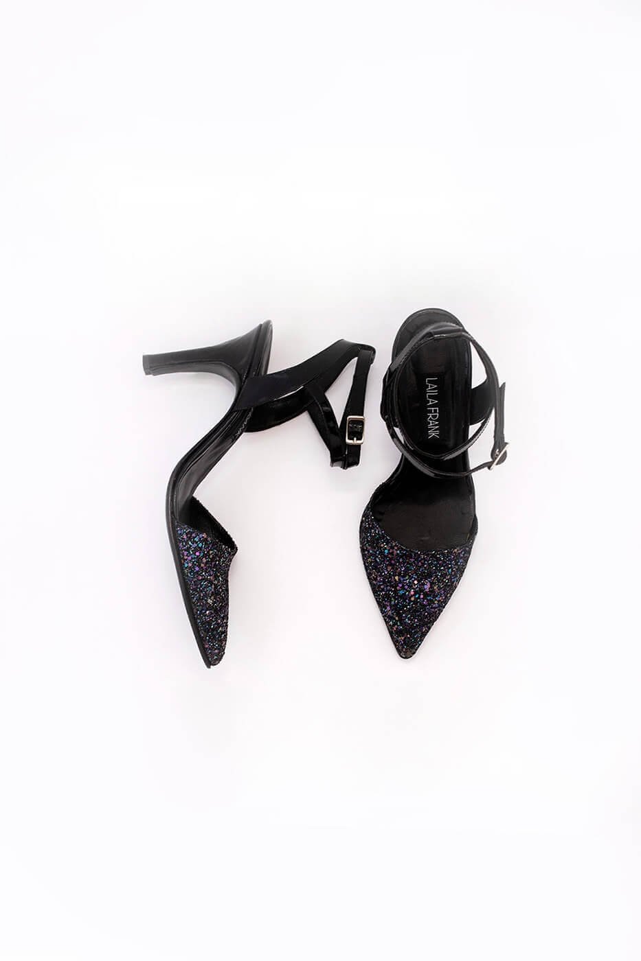Stiletto de Glitter combinado con cuero al tono, para agarre de talón con doble tira de hebilla