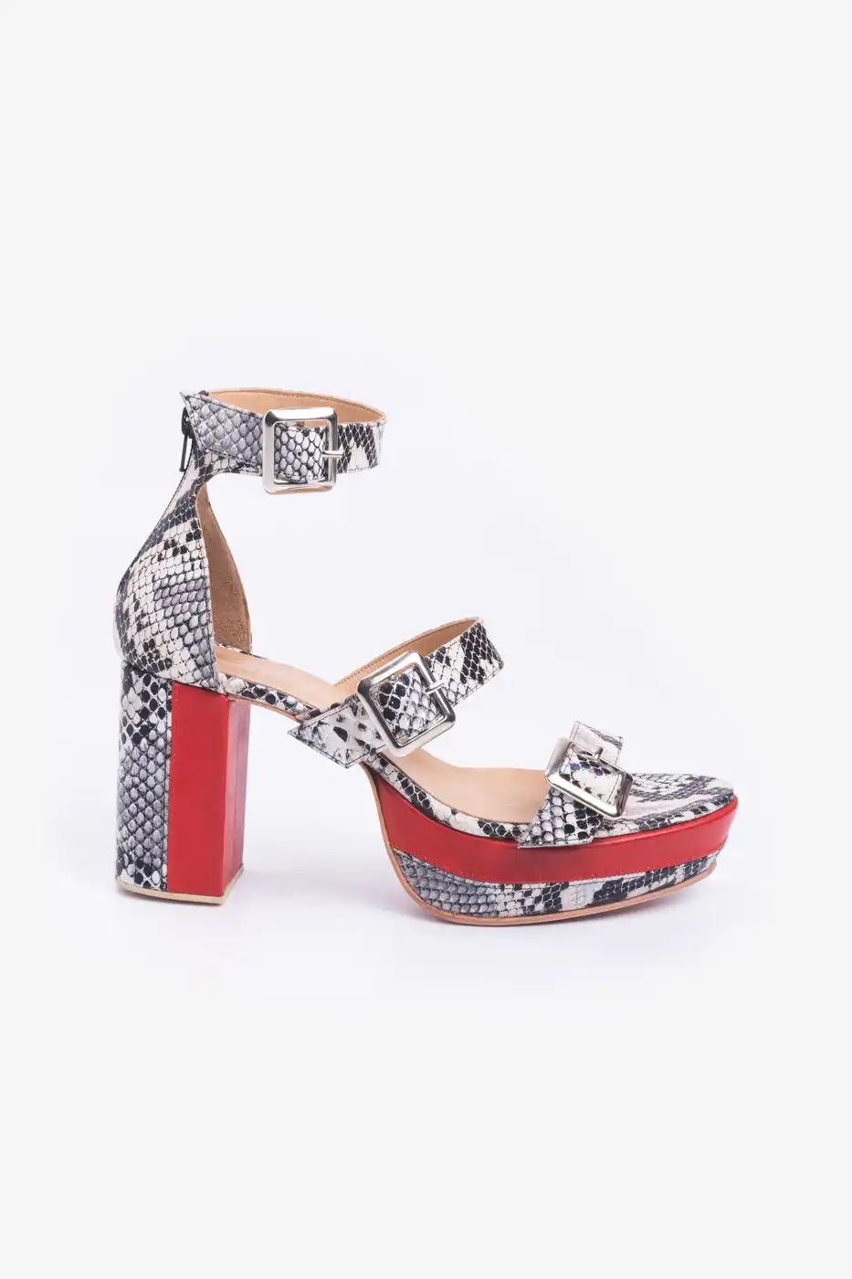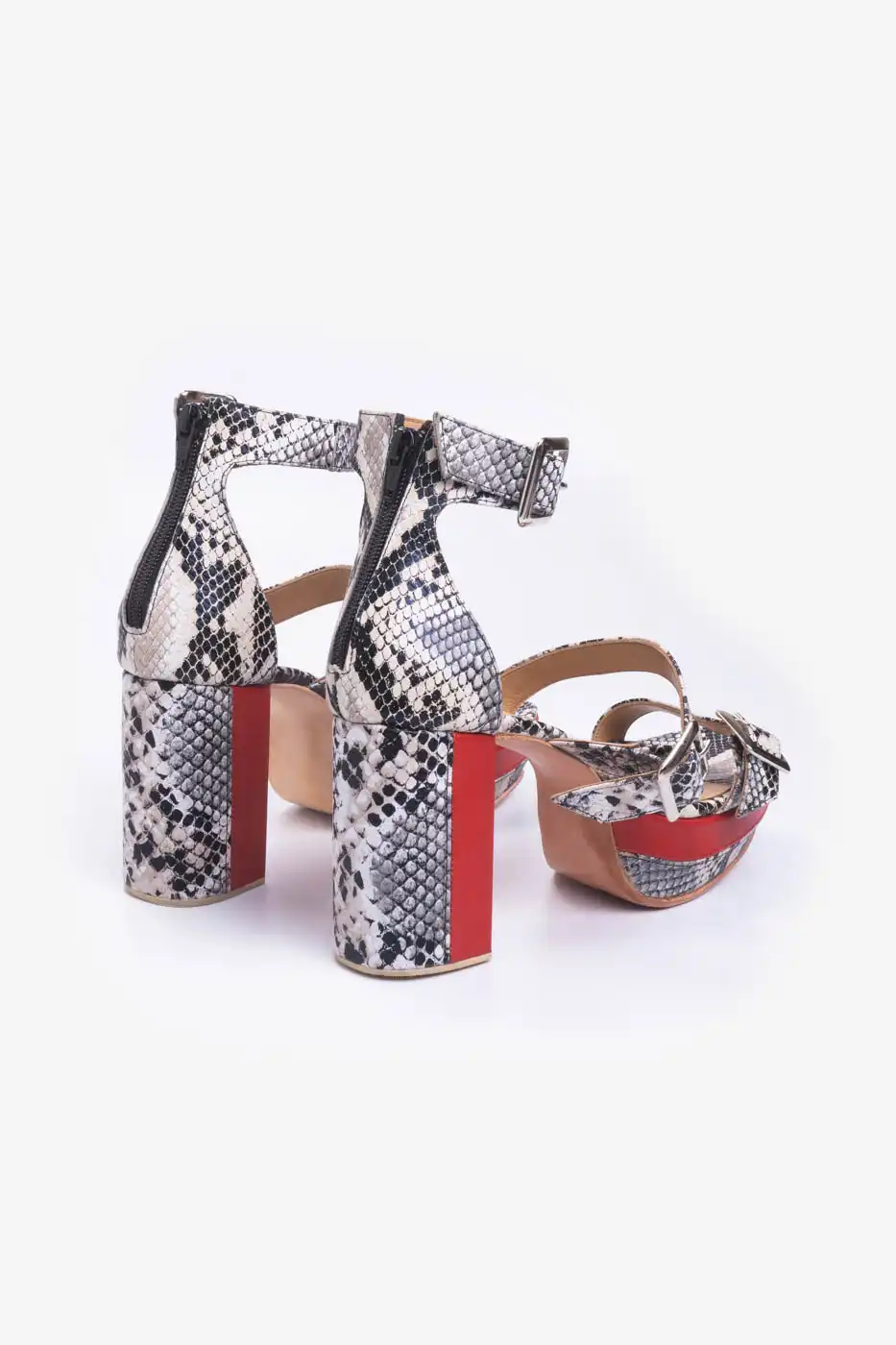 Sandalia en cuero vacuno con grabado reptil, hebillas regulables y talón con cierre